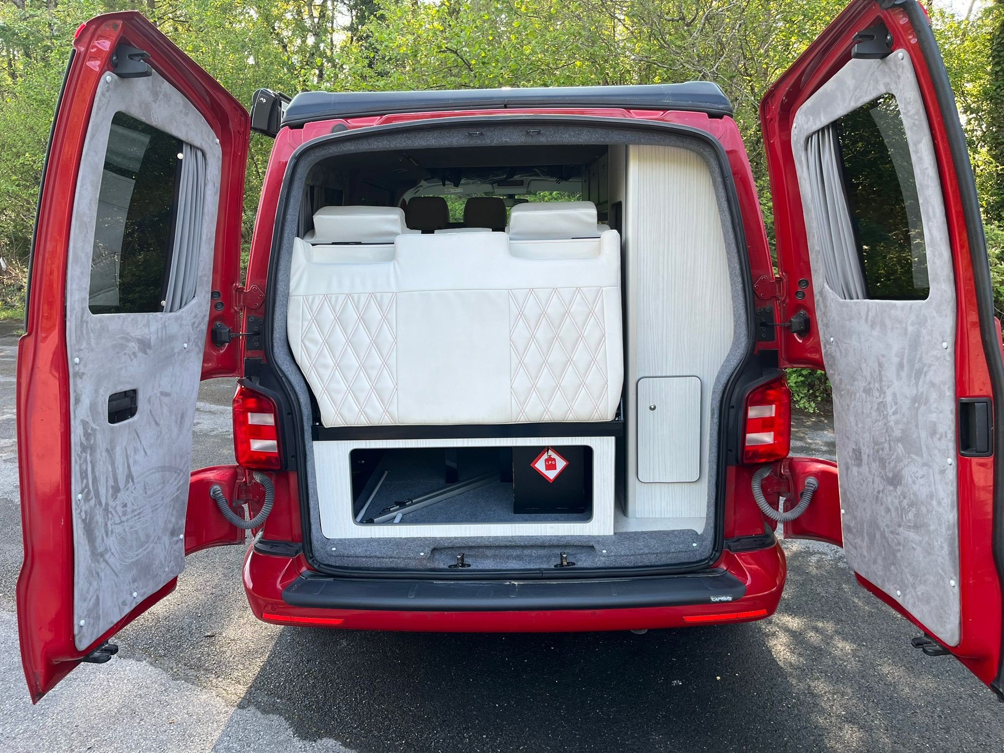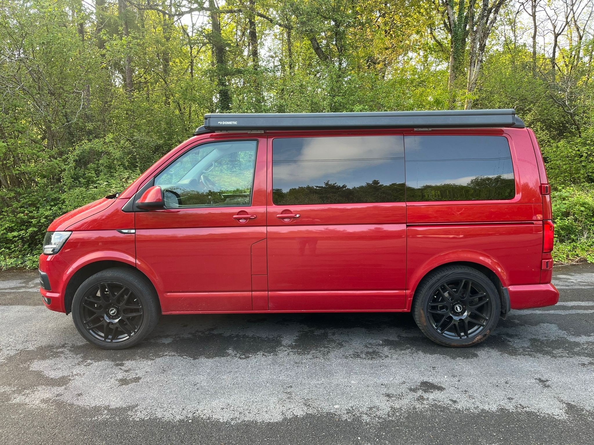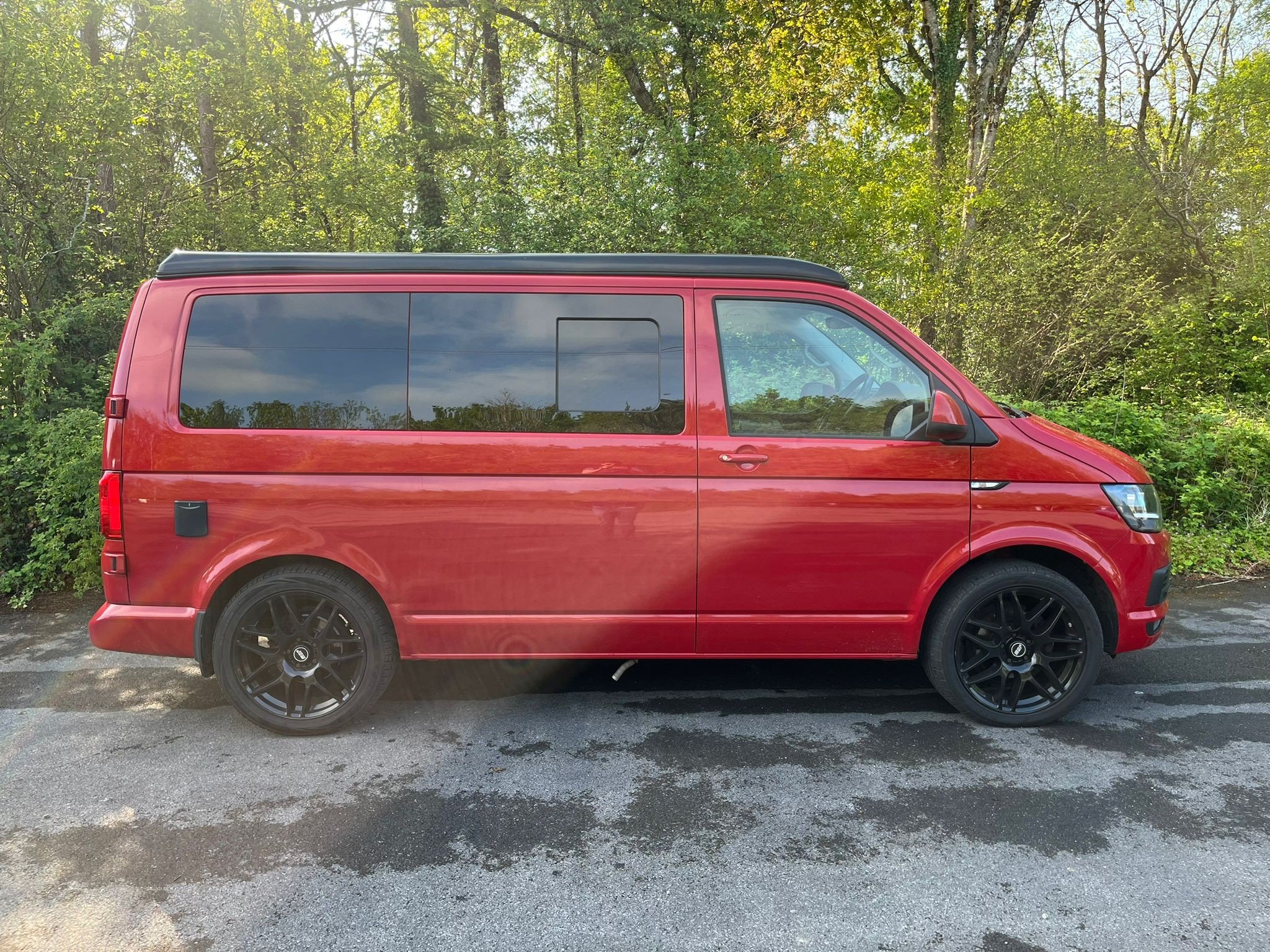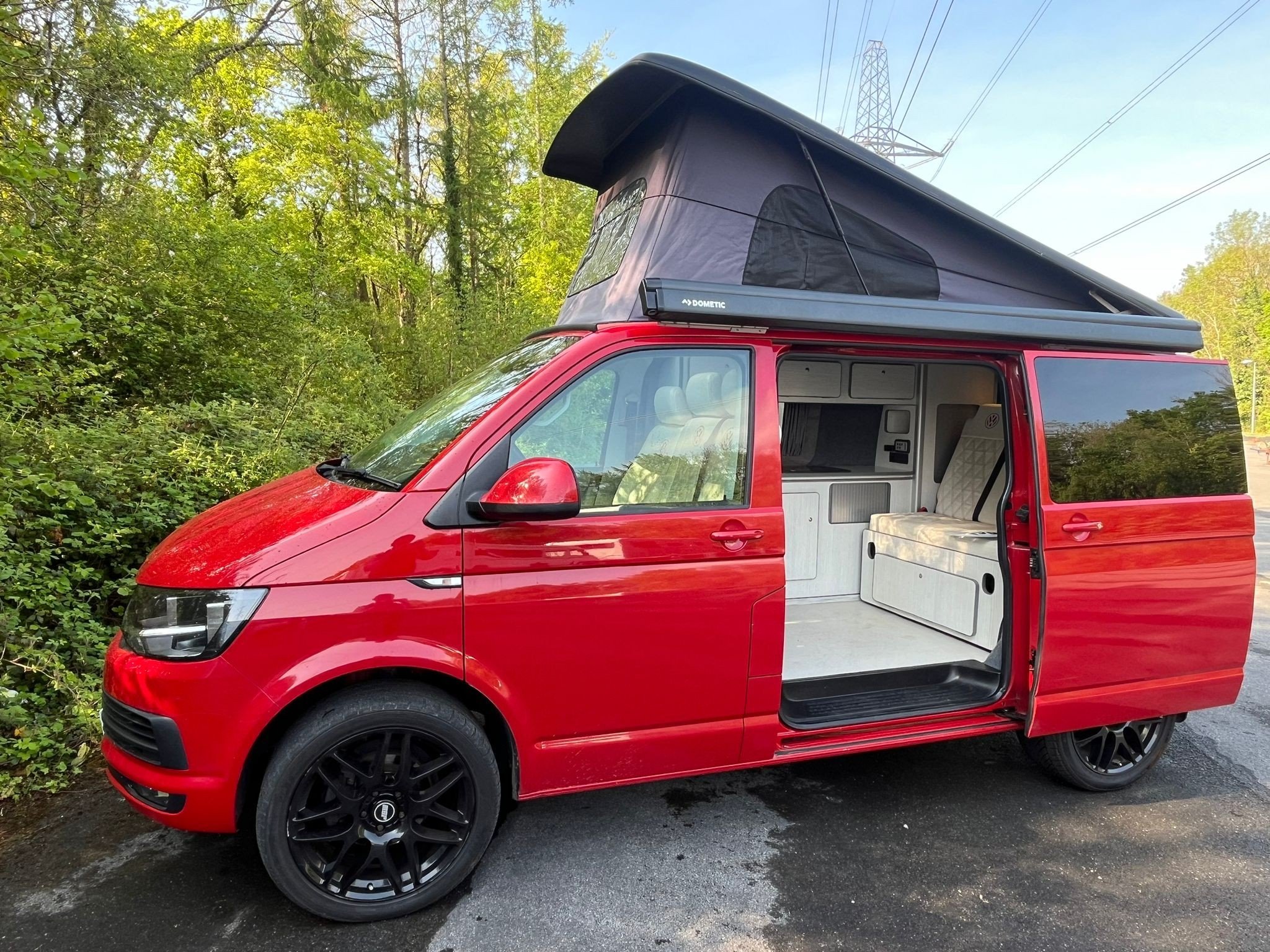 Unleash your inner explorer with this head-turning 2019 VW Transporter, finished in a bold, glossy red that commands attention wherever it goes. Sitting low on sleek black alloys, enhanced by aggressive side bars and a matching black awning, this van is more than just a camper—it’s a statement. The pop-top roof gives you extra headroom and sleeping space, transforming road trips into luxury escapes. Whether you’re chasing sunsets or carving through country roads, this Transporter brings performance, style, and freedom in one unforgettable package.